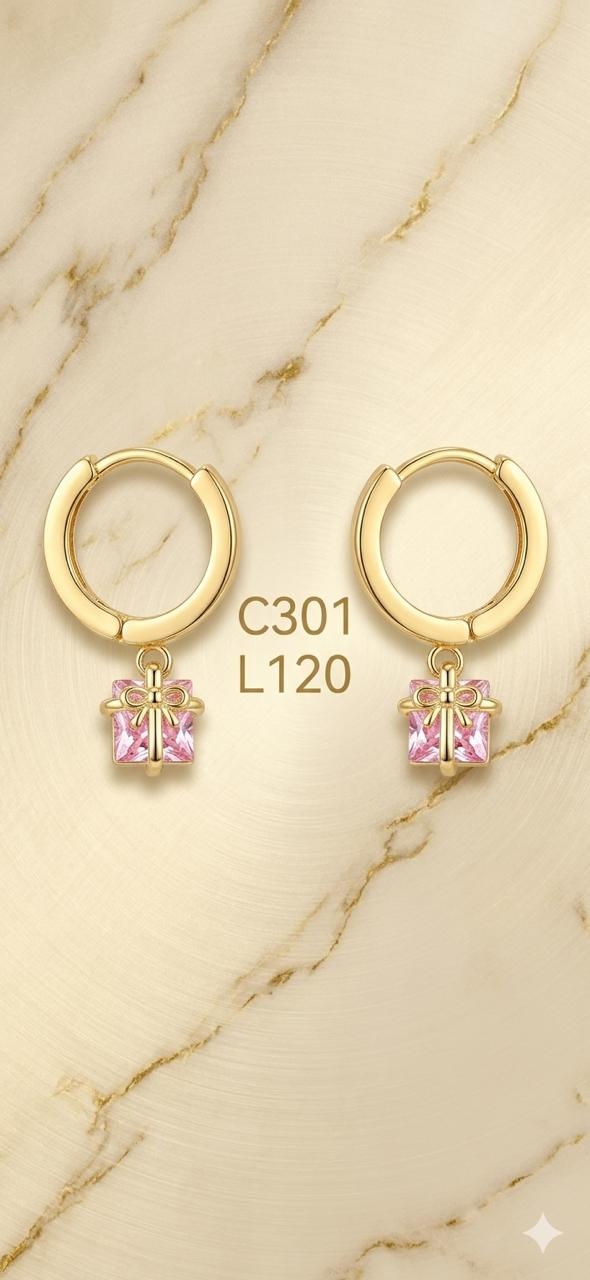 Aritos laminado de oro 18k Huggies "Pink Surprise" con Dije de Regalo en Zirconi