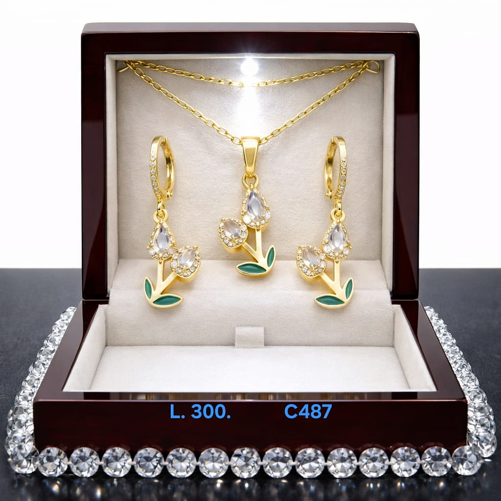 Conjunto Flor Cristal Natural – Doble Laminado de Oro 18k
