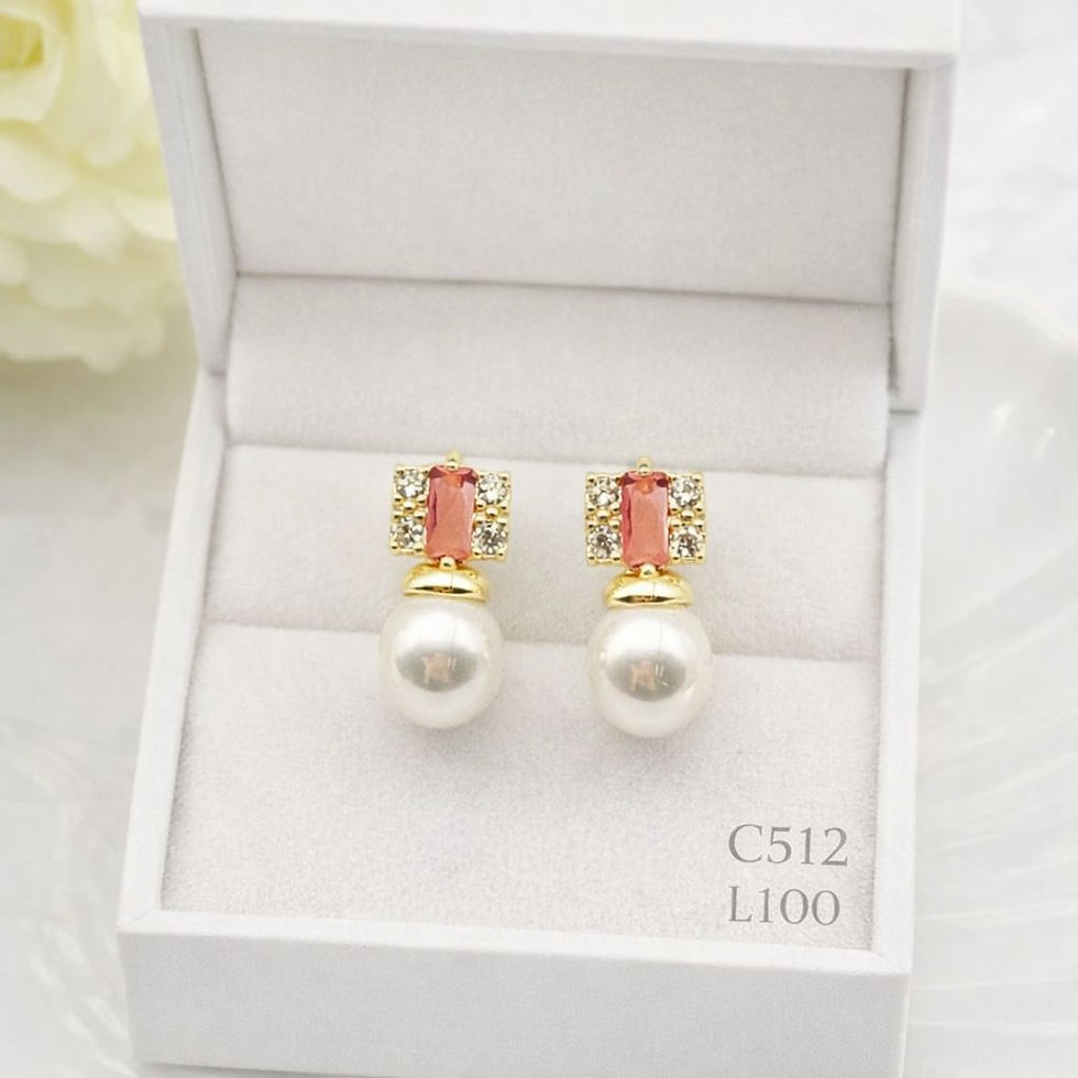 Aritos laminado de oro 18k con perla y cristal rosa rectangular
