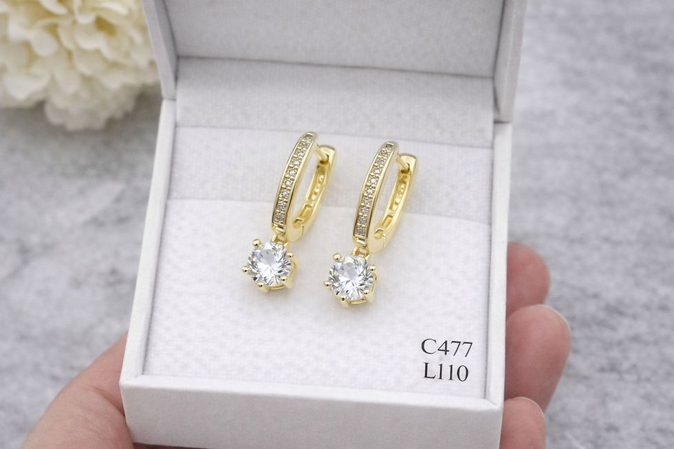 Aritos laminado de oro 18k con cristal colgante redondo brillante
